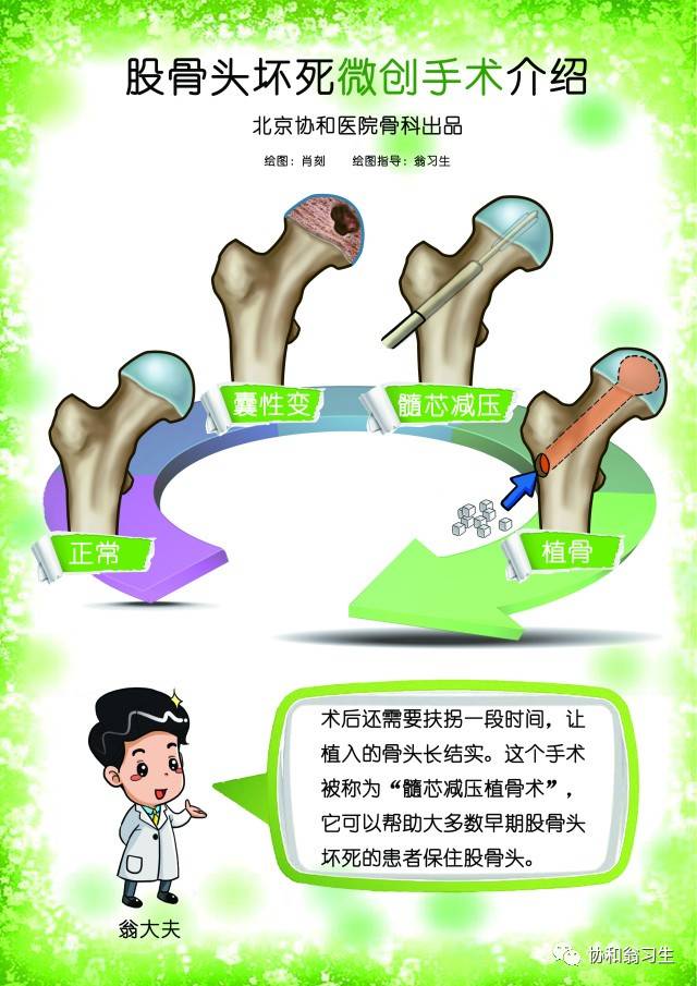 如果X线发现股骨头外形是完整的,但疼痛加重,且股骨头内出现了囊性变、部分硬化或出现了特征性的“新月征”,此时最佳的治疗方式是髓芯减压结合植骨,将股骨头内的压力降低,减缓股骨头坏死的进一步发展,70%~80%左右的患者可以获得满意的效果,保住股骨头。